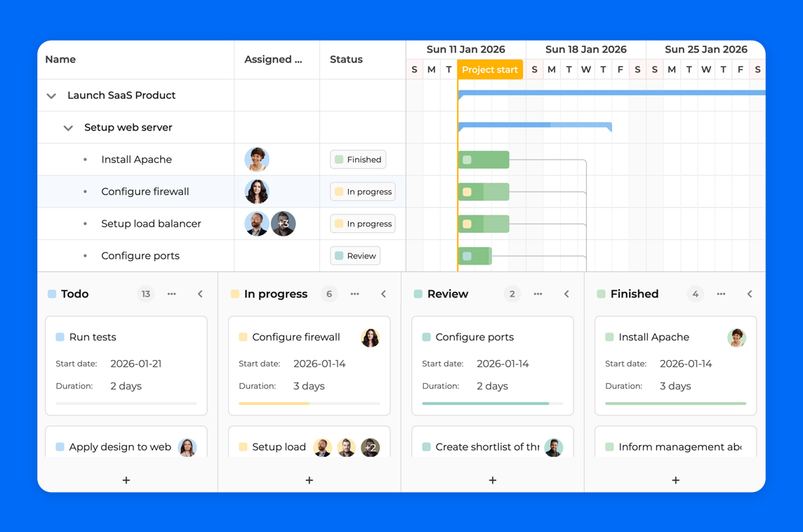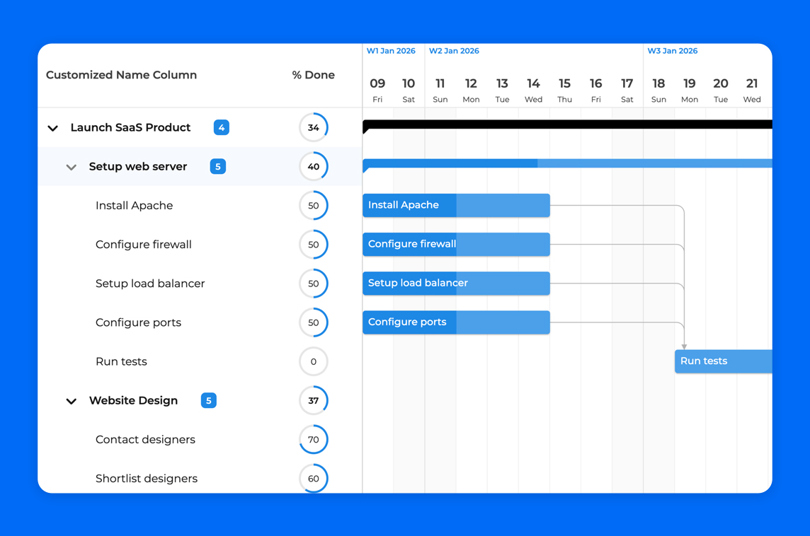 The Gantt chart itself is made with pure vanilla ES6+ and the scheduling engine was written in TypeScript. We provide a Vue wrapper to make integration seamless.