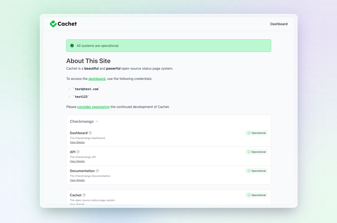 Status pages often get overlooked, but they’re an essential part of any organization’s communication strategy. They help you to keep your customers, teams, and stakeholders informed during downtime, maintenance, and incidents. Cachet makes this process as simple as possible with its easy-to-use dashboard and customizable interface."