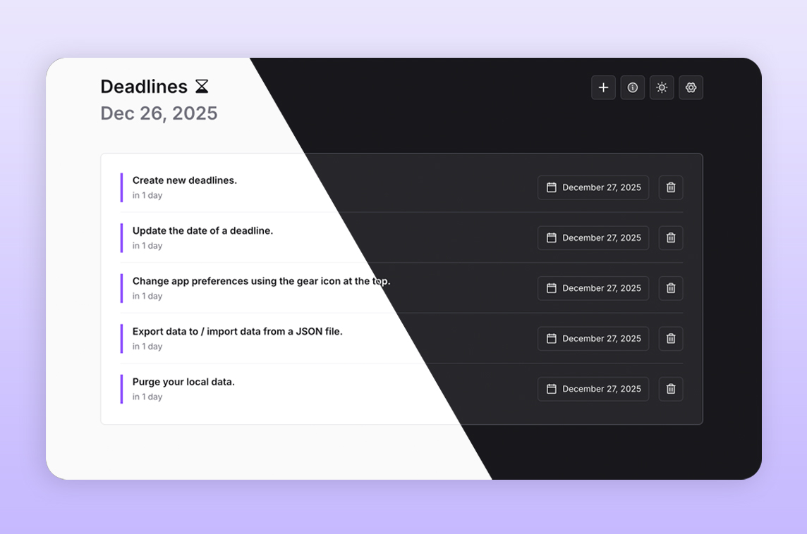 All data is stored locally in the browser π. You can import/export deadlines from/to a JSON file. It also has dark mode π."