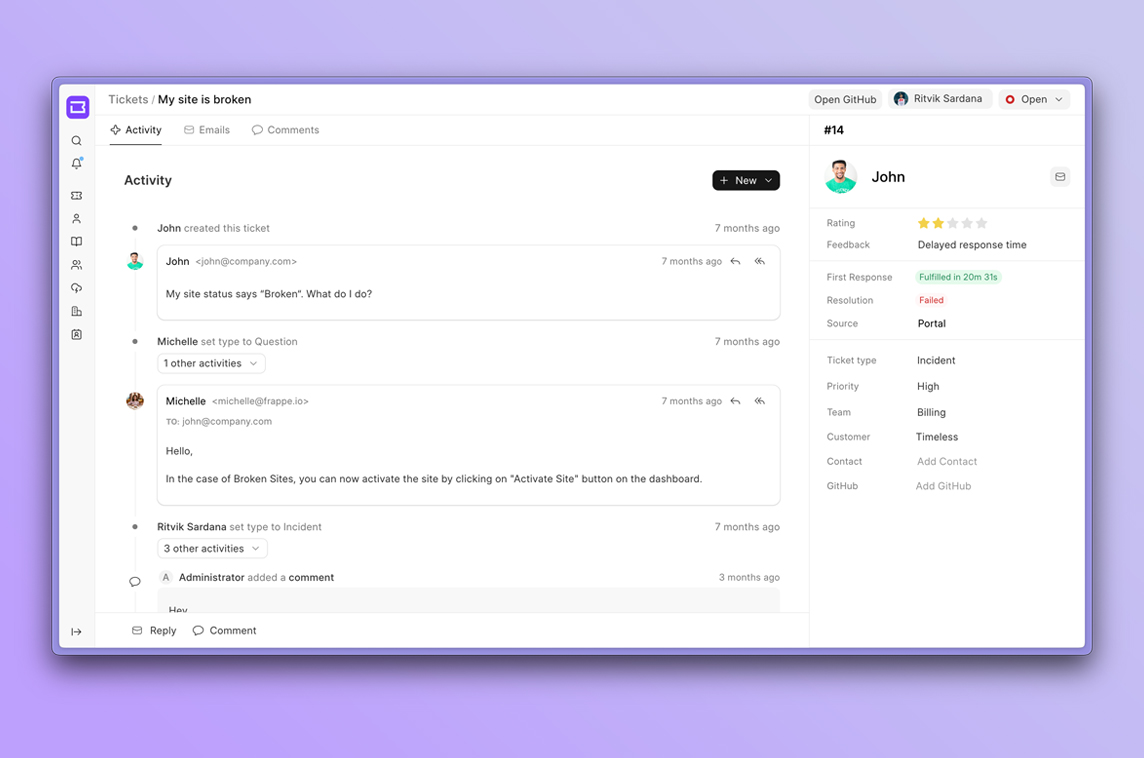 "Frappe Helpdesk is an 100% open-source Ticket Management tool which helps you streamline your company's support, offers an easy setup, clean user interface, and automation tools to resolve customer queries efficiently.