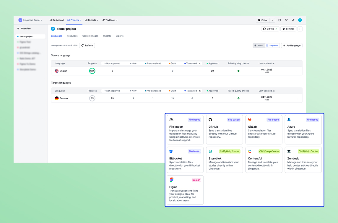 LingoHub is a collaborative translation platform that helps global teams manage and automate localization, enabling your content to reach every audience faster and with consistent quality. Designed as a single source of truth, LingoHub integrates with your existing tools - from GitHub to Figma - to keep developers, designers, and translators in sync. Cutting-edge CAT tools, AI-driven workflows, and automated quality control enable teams to succeed in international markets.