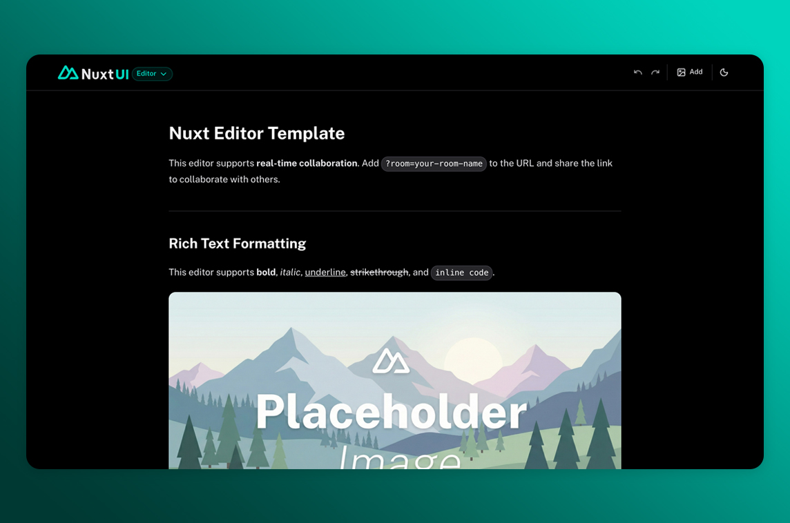 "This Notion-like WYSIWYG editor with AI-powered autocompletion in Vue & Nuxt is built with Nuxt UI and TipTap, showcasing the powerful UEditor component with advanced editing capabilities."
