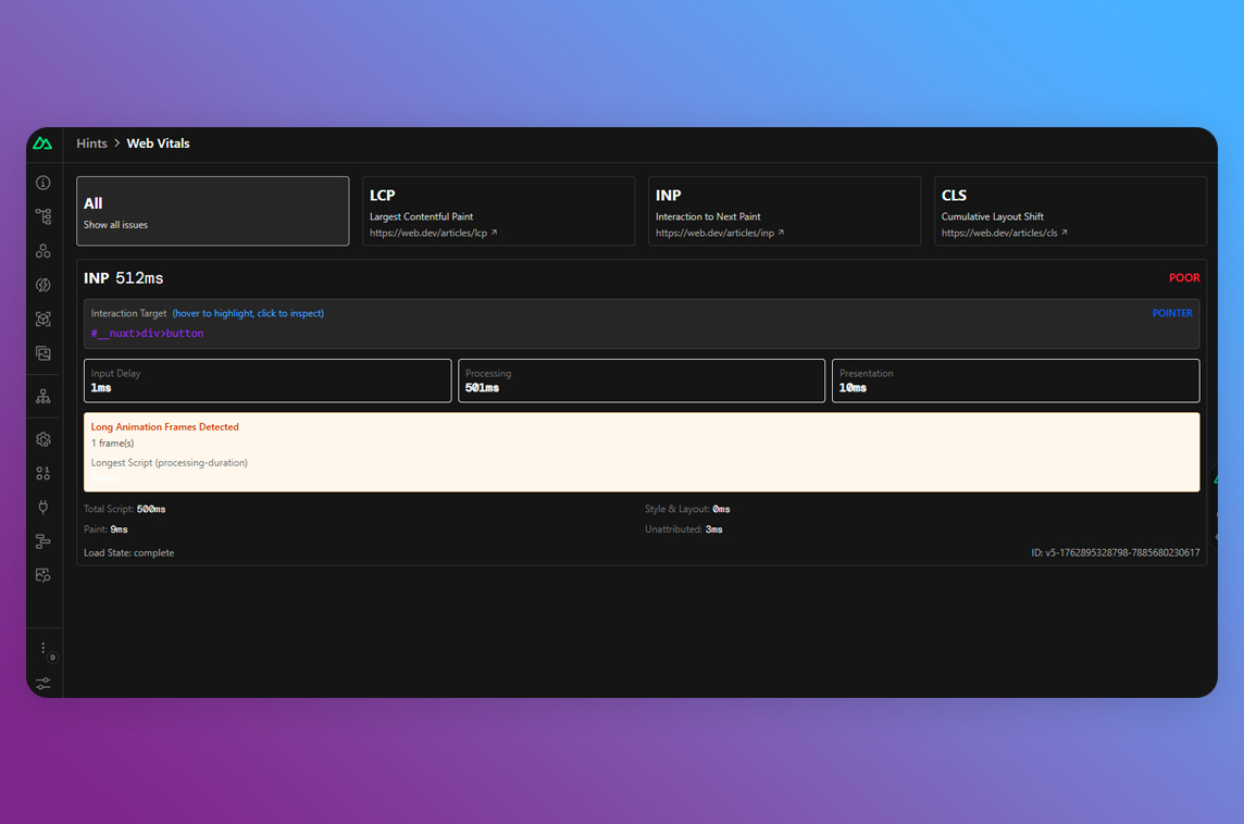 Nuxt Hints integrates directly into the Nuxt DevTools, giving you actionable insights to improve your web vitals, fix hydration mismatches, and audit third-party scripts without ever leaving your development environment."