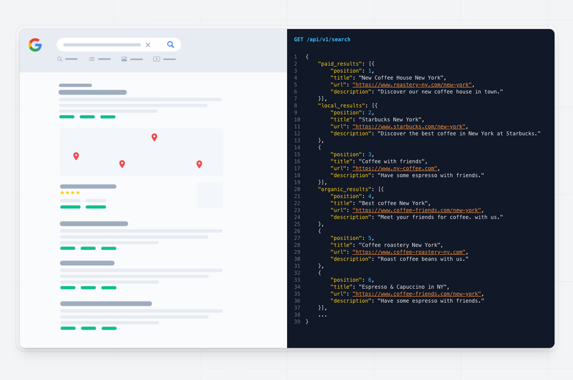 Build geo-localized queries (country, language, device), preview normalized JSON for organic/ads/PAAs/maps, and export in one click.