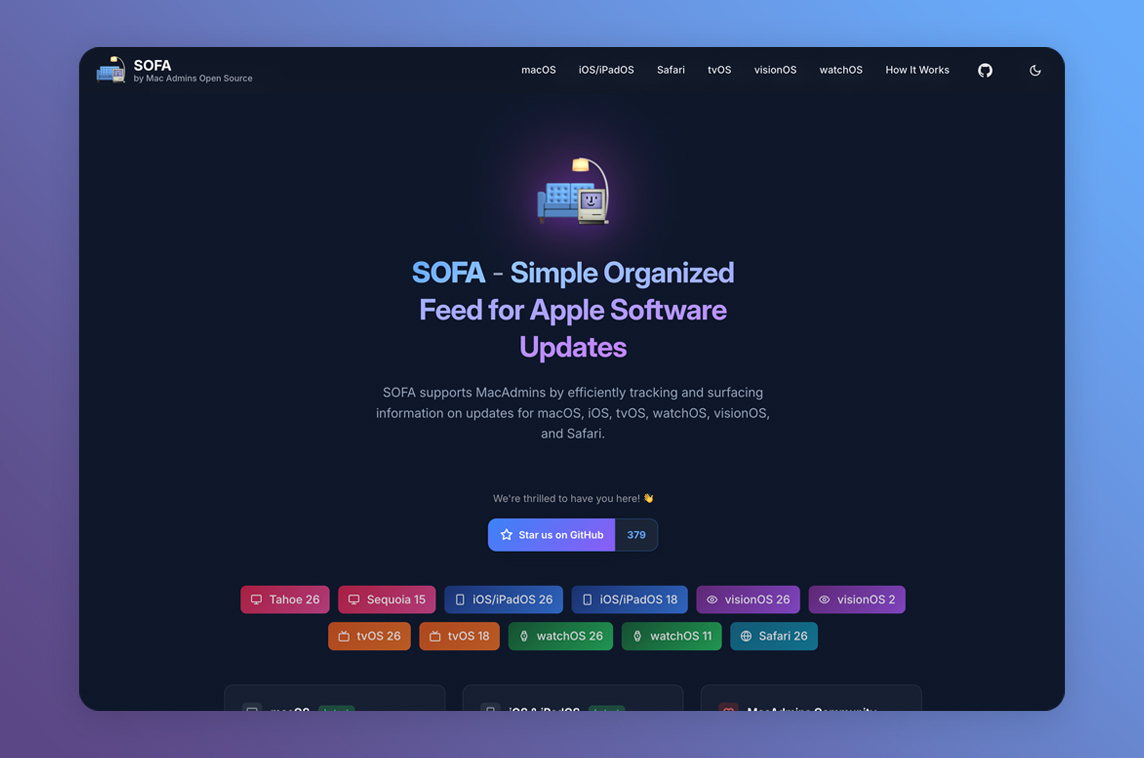 "SOFA supports MacAdmins by efficiently tracking and surfacing information on updates for macOS and iOS. It consists of a machine-readable feed and user-friendly web interface, providing continuously up-to-date information on XProtect data, OS updates, and the details bundled in those releases.