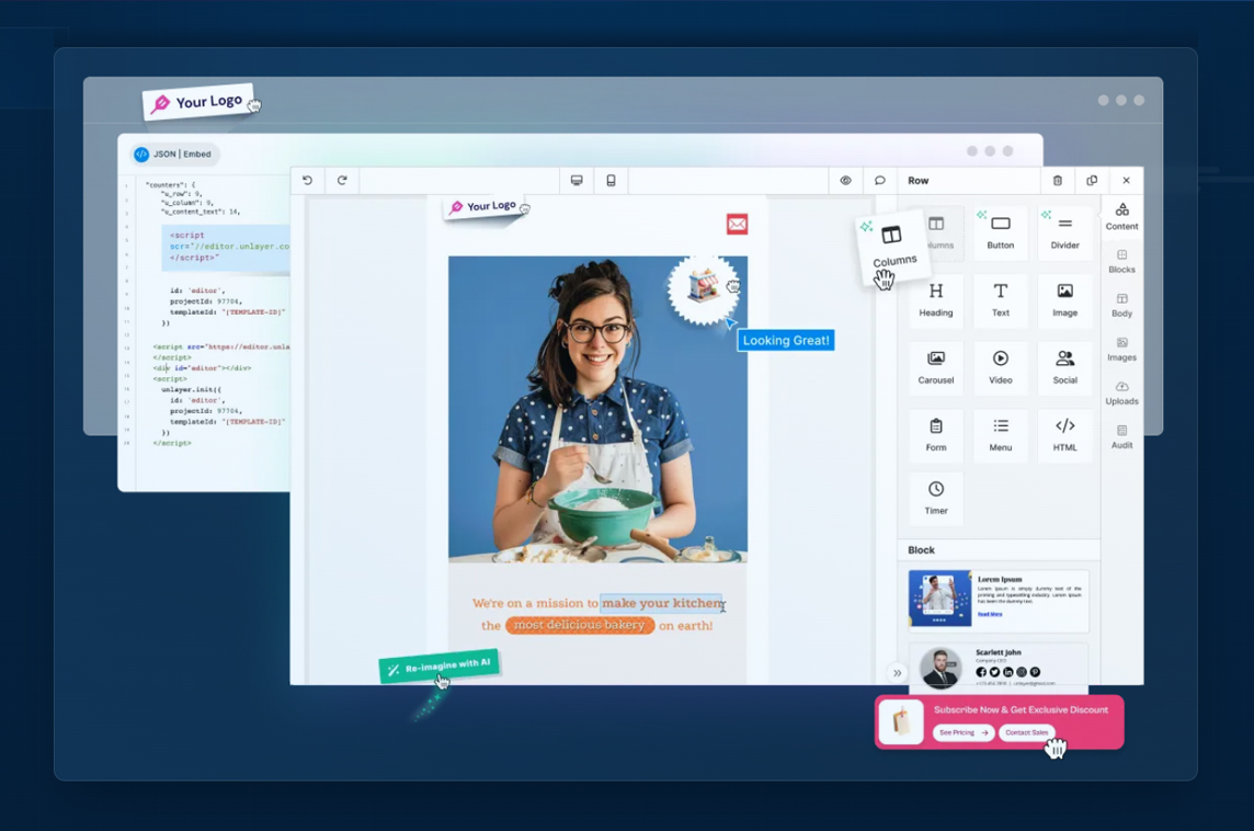With Unlayer’s email builder, your users don't have to spend hours in a designer's office creating emails. They can just drag and drop! Once the email is designed, your users can use your application to send it to their audiences.