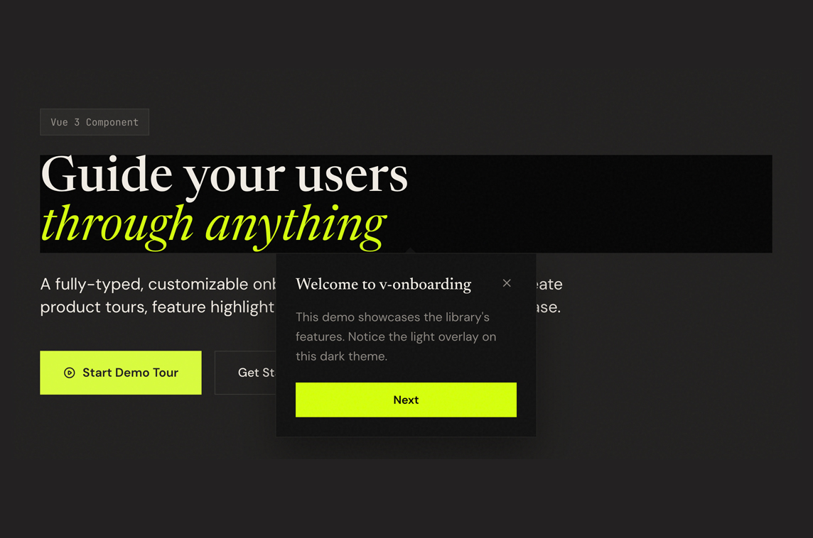 v-onboardingis a fully-typed, customizable onboarding component with SVG overlays, smart positioning, and accessibility built-in."