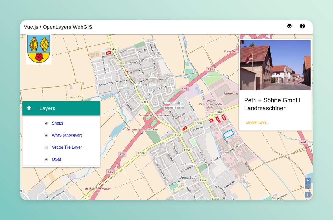 "Wegue (WebGIS with OpenLayers and Vue) combines the power of Vue.js and the geospatial savvy of OpenLayers to make lightweight webmapping applications. For styling and pre-defined UI-components the Material Design component framework Vuetify is used.